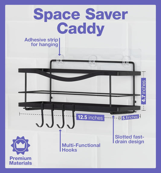 Shower Shelf - Self Adhesive Shower Caddy with 4 Hooks - No Drill Large Capacity Stainless Steel Rack - Aesthetic Organizer for Bathroom Wall Decor - Matte Black